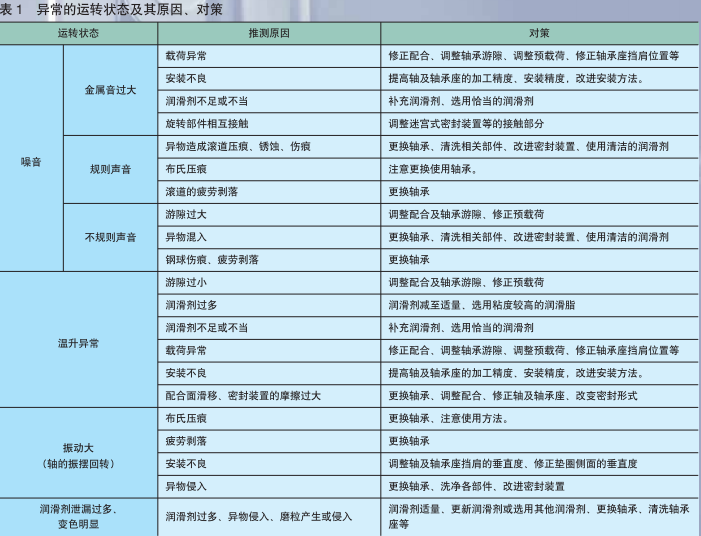 檢查軸承的旋轉(zhuǎn)聲音,振動(dòng),溫度以及潤滑劑的性狀,判斷何時(shí)需要補(bǔ)充或更換潤滑劑。